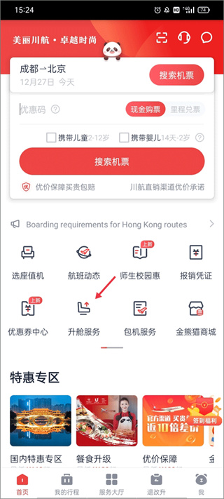 1、进入首页找到升舱服务,选择已有行程进入下一步操作。