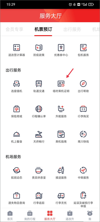 4、进入服务大厅找到出行服务,点击临时乘机证明功能。