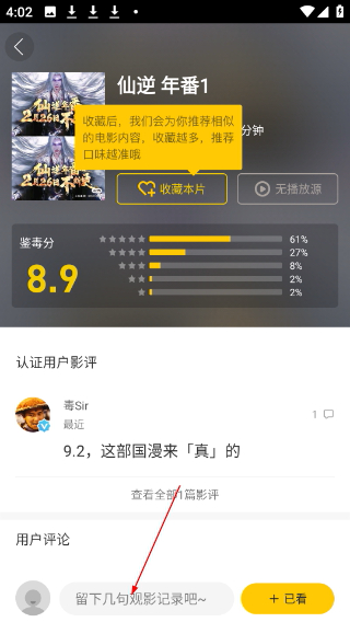 4、进入详情页后,可在底部的评论输入框中,留下你的观影记录,完成互动。
