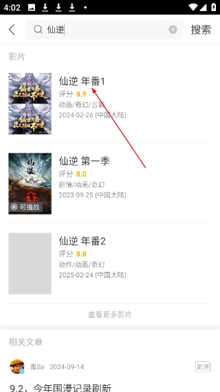 3、在搜索结果列表中,点击《仙逆年番1》,进入影片详情页面。
