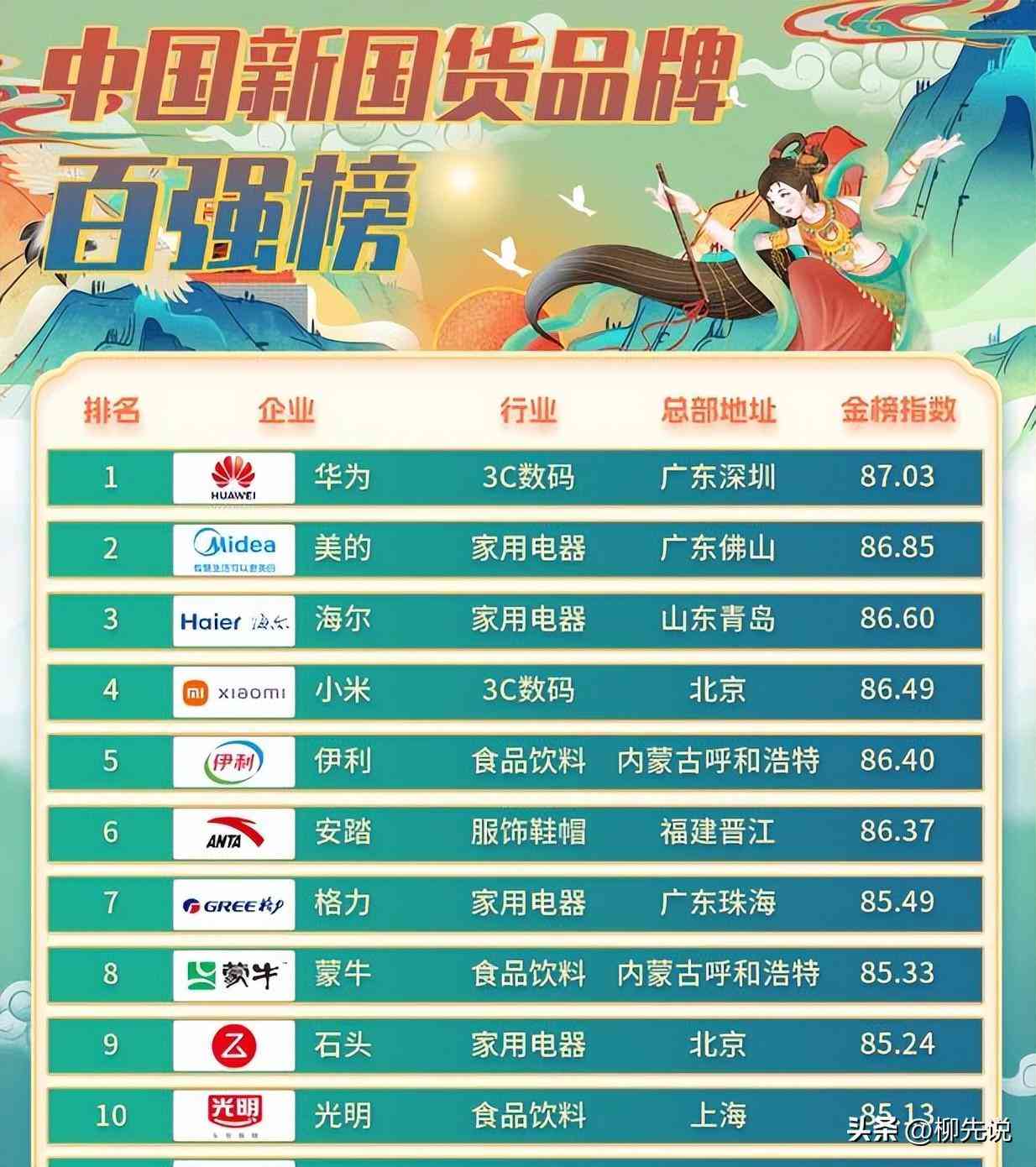 2022年中国新国货品牌百强榜前五名:华为、美的、海尔、小米以及伊利。中国新国货品牌百强榜第1名是华为,总部位于广东深圳,金榜指数87.03。品牌愿景与使命是把数字世界带入每个人、每个家庭、每个组织,构建万物互联的智能世界。已经成为全球领先的ICT(信息与通信)基础设施和智能终端提供商,服务全球30多亿人口。近十年累计投入的研发费用超过人民币8450亿元,在全球共持有有效授权专利4.5万余族(超11万件)。个人及家庭产品包括有手机、电脑、智慧屏、路由器等。今年11月份,华为在深圳举行华为Pocket S及全场景新品发布会。新品华为智慧屏V、全屋智能3.0等多款全场景新品集中亮相。