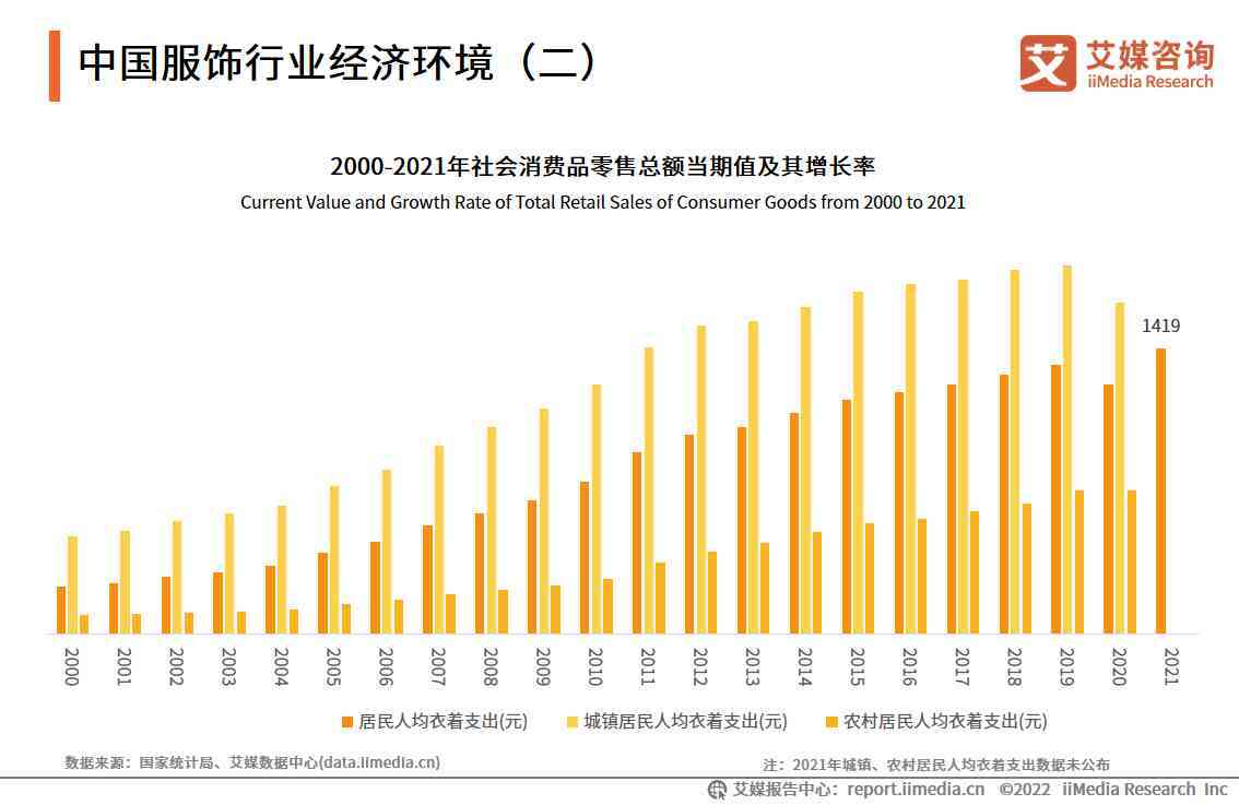 数据显示,2021年我国人均衣着消费达1419元,消费金额创新高。艾媒咨询分析师认为,中国居民消费水平显著上升,为服饰行业打下良好的发展基础,且疫情期间消费者的消费需求转移至线上,缓解了疫情对线下服饰行业消费的冲击。