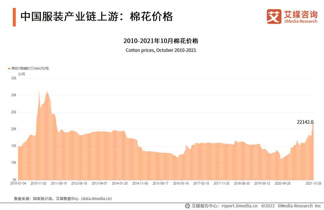 数据显示,2021年10月棉花价格为22142.0元/吨。受全国各地疫情影响,多地货运受阻,下游需求整体承压,纯棉纱线类产品价格下降,销售亏损增多,对棉花原料的采购多以刚需为主。