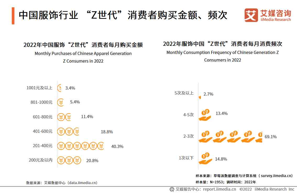 调研数据显示,中国服饰 “Z世代”消费者每月购买金额集中于400元以内,200元以内占20.8%、201-400元占40.3%;每月消费频次集中于2-3次,占比69.1%。