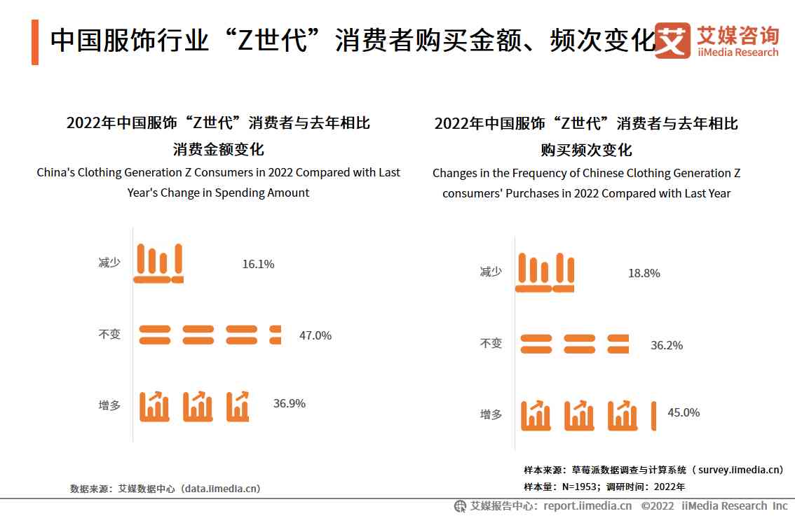 调研数据显示,中国服饰 “Z世代”消费金额同比上年增加的占比为36.9%、不变为47.0%;消费频次同比上年增加的占比为45.0%、不变为36.2%。