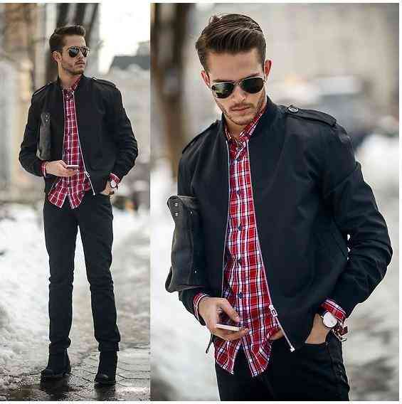 2.休闲商务版:一件合适的夹克外套,一件红色的磨毛衬衫,一条黑色修身的小脚牛仔裤,一双反帮皮鞋,上身的效果是不是有点小酷酷的呢?能把衣服穿上人人都会,但是能把一件普通的男士磨毛衬衫衣服穿得那么有品位,不是每个人都会哦!你是不是对这样的搭配动心了呢?