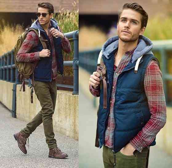 5.纯休闲范: 一件红灰相间的磨毛男士长袖衬衫,一件戴帽子的小棉袄背心,一条军绿色的休闲裤,一双棕色的高帮休闲鞋,加上一个墨绿色的背包,是旅行者还是上班族呢?我都分不清了,十足的街头风,酷酷的造型,自然也少不了磨毛衬衫这个“猪脚”的存在了。