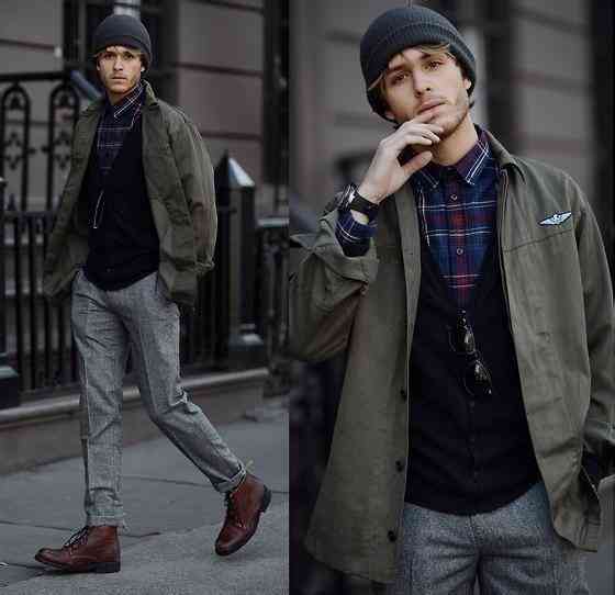 6.十足休闲风格:冬天的你一顶黑色毛线帽,自然少不了磨毛长袖格子衬衫,军绿色的休闲夹克,一件小马甲,一条休闲裤,一双高帮鞋,有没有被这样的街头风格镇压住,足足的休闲风格,时尚的街头搭配,让你“衣”酷到底