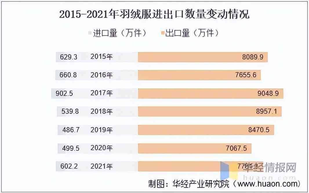 此外,全球经济的复苏和能源危机的影响,羽绒服的出口需求随之高升。Statista数据显示,2017年,全球羽绒服市场总值约为1013亿美元,预计到2025年将达到3845亿美元。中国是全球最大的羽绒服生产基地,随着产品设计、材质工艺、营销推广上的持续精进,中国的羽绒服在国际市场的品牌影响力也日益壮大。海关数据显示,2019年我国羽绒服出口量8470万件,2020、2021年出口量受疫情影响虽有下降,也分别达到了7067万、7782万件。