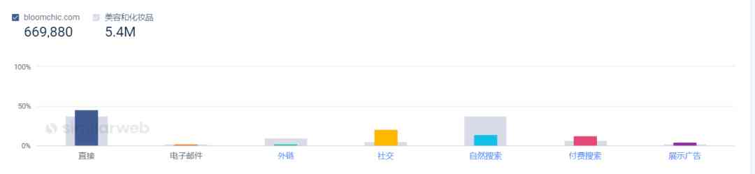 在所有渠道中,BloomChic的直接访问占比达45.47%,证明品牌的直接受众高,愿意直接搜索网站域名。可见,一个简洁易记、彰显品牌特色的域名可以替网站加不少分,因此,在选择网址时,域名要设置得相对较短且简单易记,必须包含品牌名,避免累赘信息。