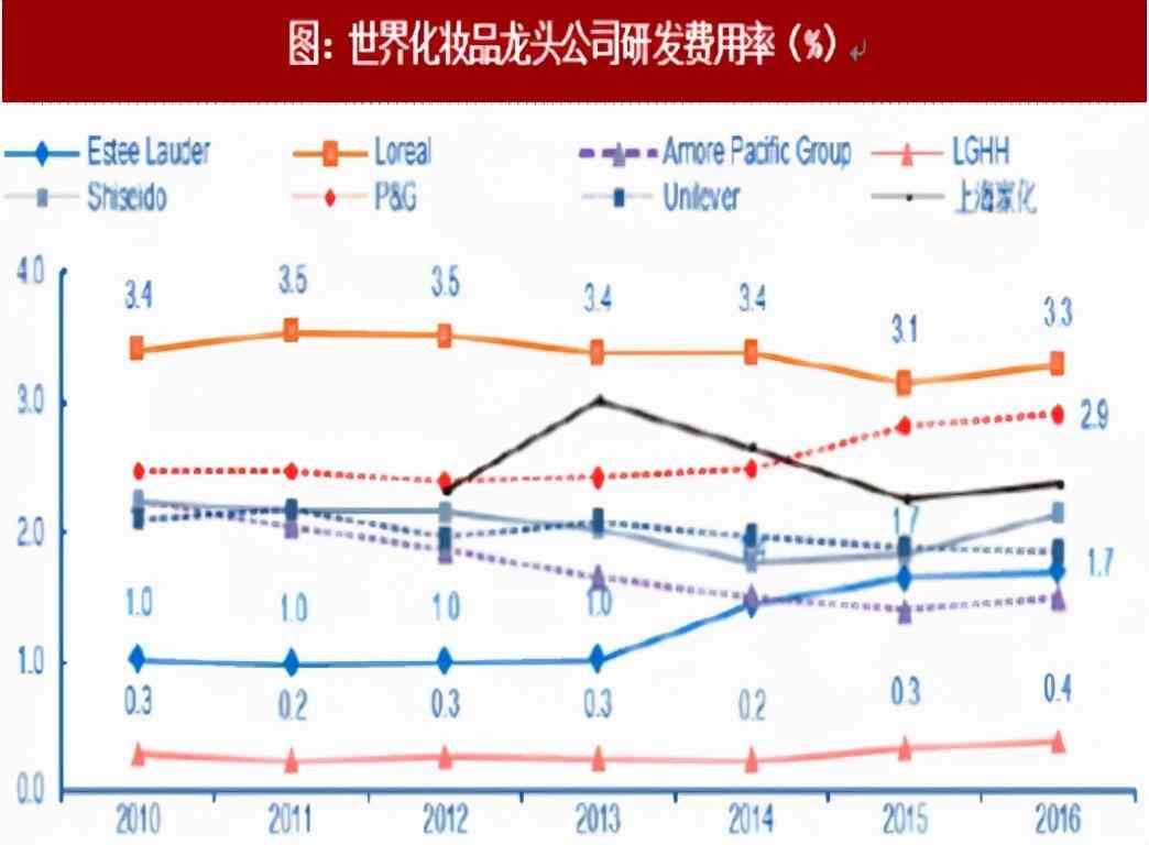 根据招股书,毛戈平股份2014-2016年的毛利率分别为81.5%、79.7%、78.22%,同期欧莱雅、资生堂、上海家化、欧舒丹、自然美5家公司的毛利率平均值分别为73.27%、73.17%、73.2%,均低于毛戈平股份。不过与欧莱雅等企业相比,毛戈平股份的研发投入较低。