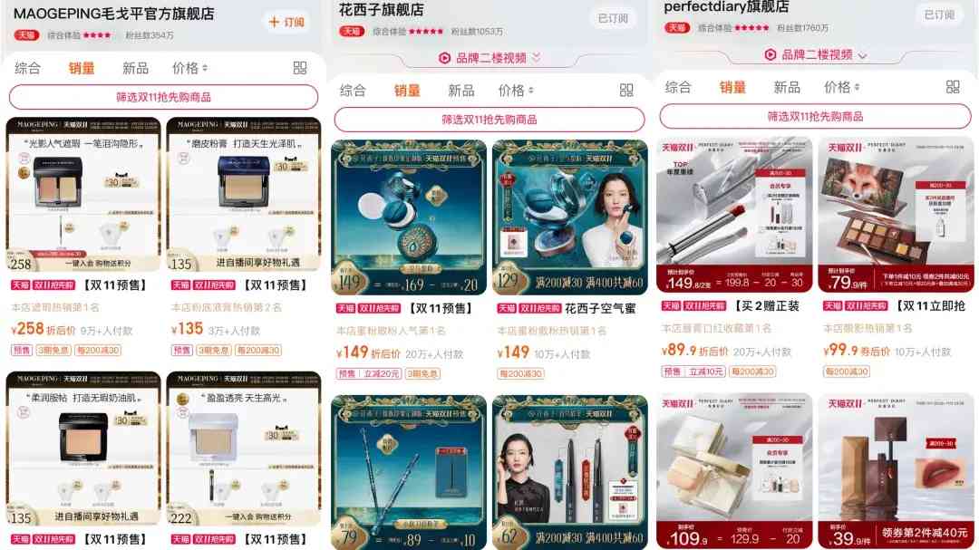 与花西子、完美日记天猫旗舰店动辄上千万的粉丝数量相比,毛戈平天猫旗舰店的粉丝数量不到500万。天猫旗舰店显示,毛戈平销量.的产品有9万+人付款,花西子、完美日记销量.的产品付款人数均超过20万。