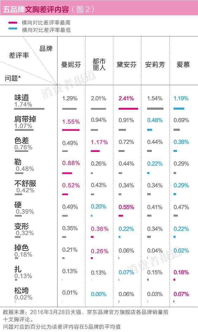有故事的女同学,你的文胸佩戴史一言难尽吗?《消费者报道》通过对比曼妮芬、都市丽人、黛安芬、安莉芳和爱慕等五品牌七万+条消费者的评价数据,以及淘宝指数,告诉你一线文胸品牌的槽点都在哪里,多数女性都喜好怎样的文胸。