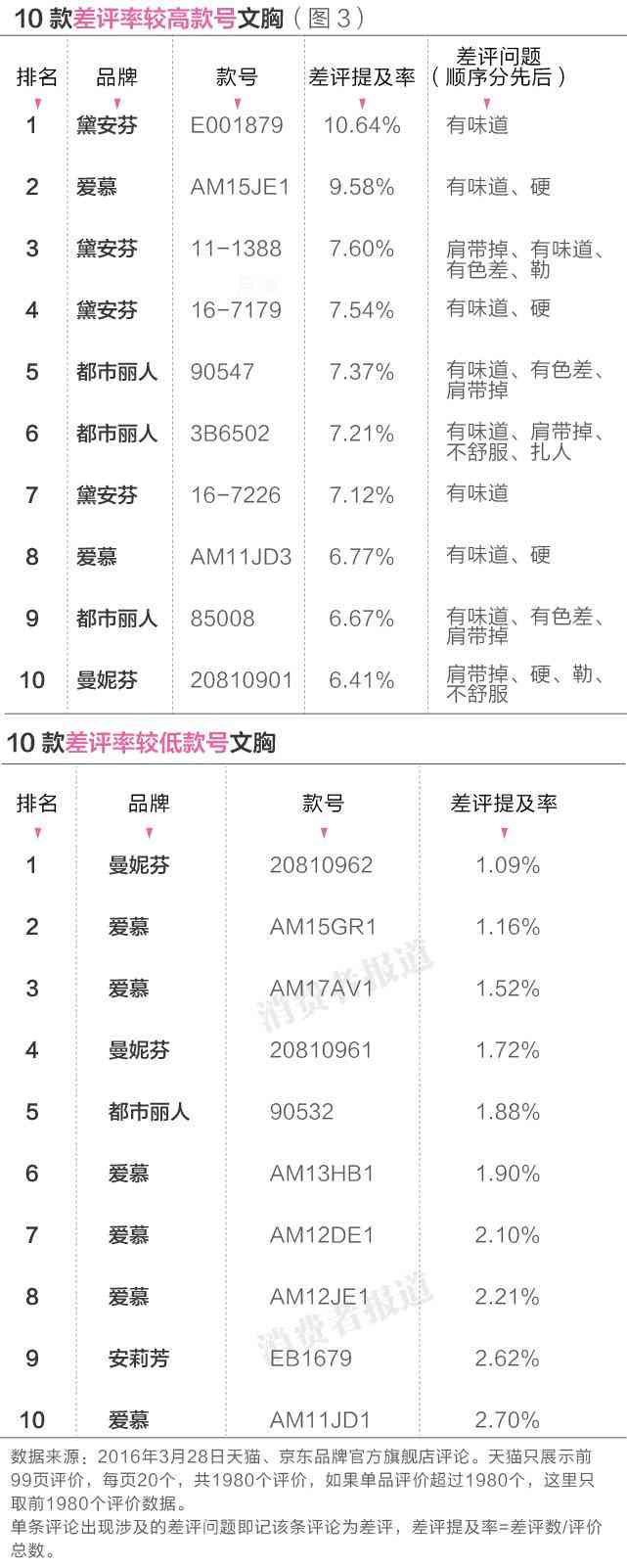 除了整体品牌之外,具体型号的槽点也不尽相同。本刊列出了此次对比的84款文胸中差评占比较高的和较低的十款文胸,供消费者具体参考。(如图3)