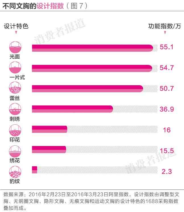 而在设计特色上,光面、一片式和蕾丝文胸是消费市场一线梯队。(如图7)