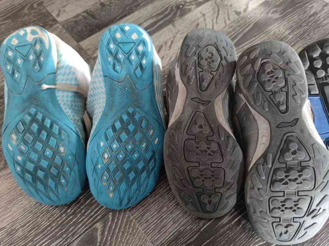 看看它被磨损的鞋底(左),就知道荣哥上到三年级的训练量有多大了,当然,凭心而乱,这双的钉的确没有李宁耐磨,右边那双是李宁。