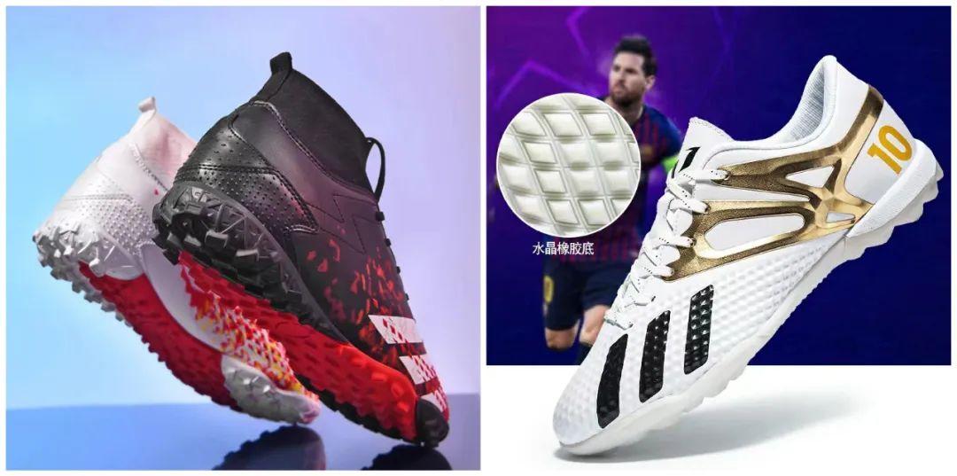 左边这双选用的梅西15周年纪念款的配色(长相不一样),右边这双鸳鸯鞋是2020年的猎鹰,红黑白配色被认为是阿迪这个系列最经典的配色,当然我觉得鸳鸯鞋更好看,这就是国产的好,还可以买两只不一样配色,十分DIY。