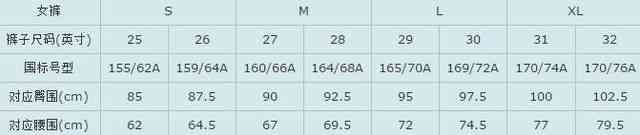 女裤尺码对照表