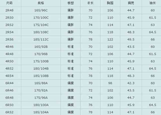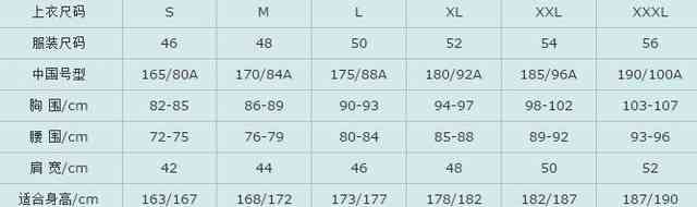 男装标准尺码对照表