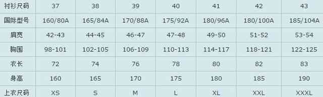 男衬衫尺码对照表