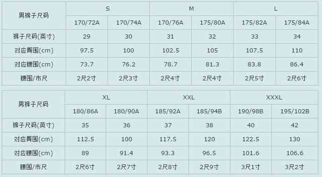 男裤尺码对照表