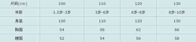 说明:上述提供的计算公式是根据经验得到的数据参数,试用于绝大多数人群,不适用于特殊体型要求。注意:表格中尺码项即为小孩身高,请顾客按照尺码项选择合适的码数,宝贝幼嫩肌肤。