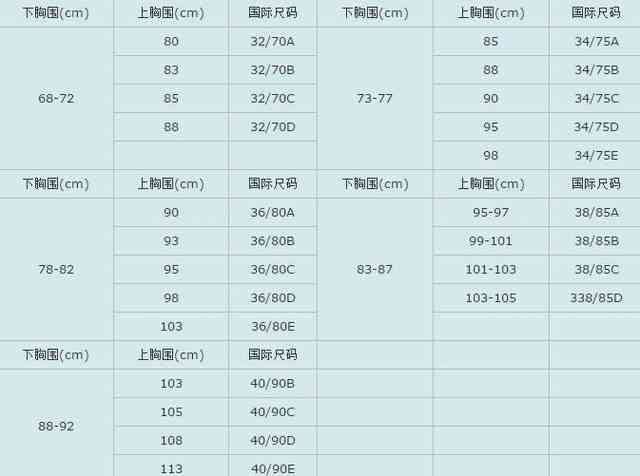 文胸尺码对照表