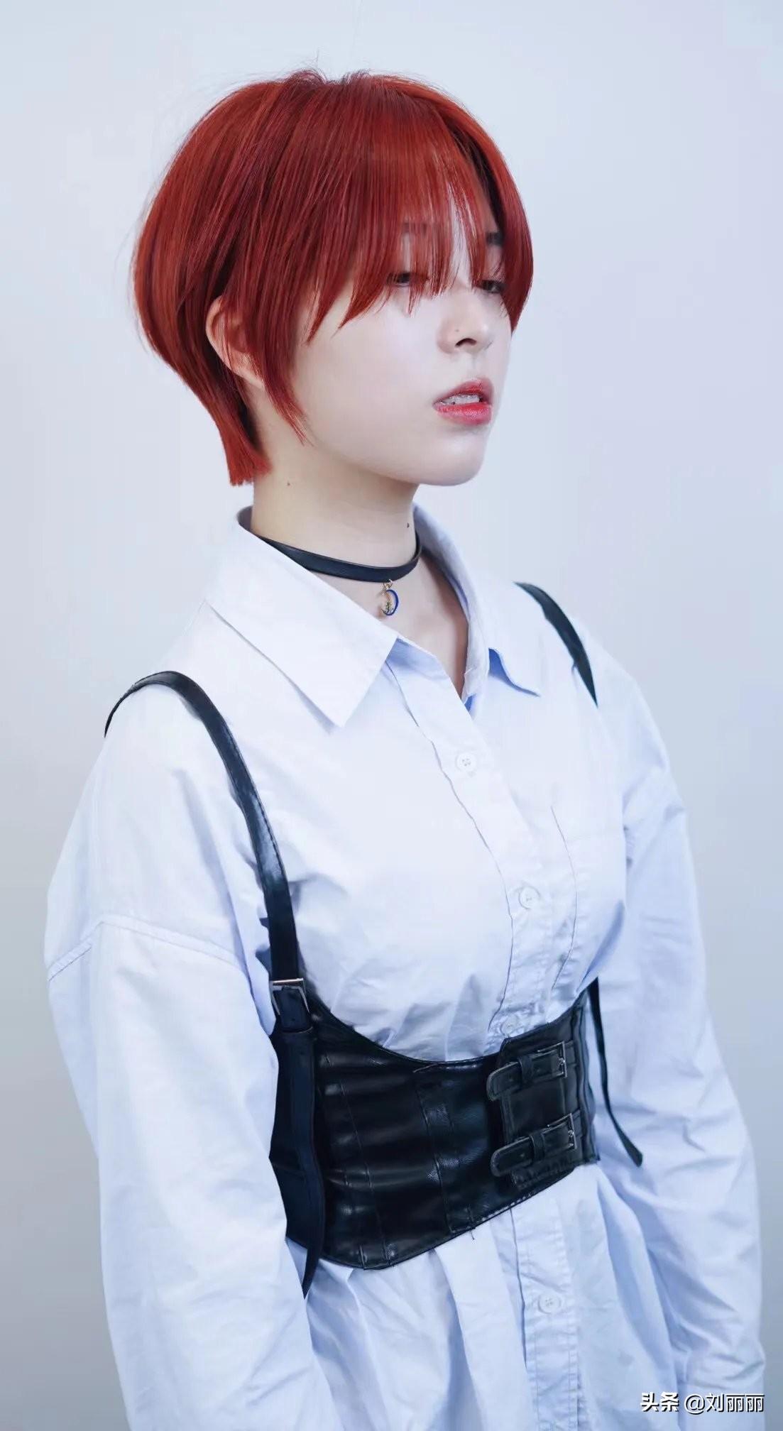 全头红色的染发配上立体短发,高贵精致满满的活力,前额法式刘海也是演绎的很到位,把五官修饰得很完美。