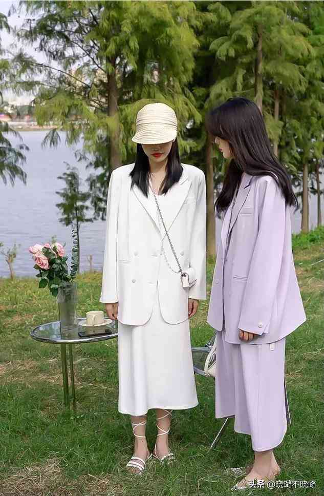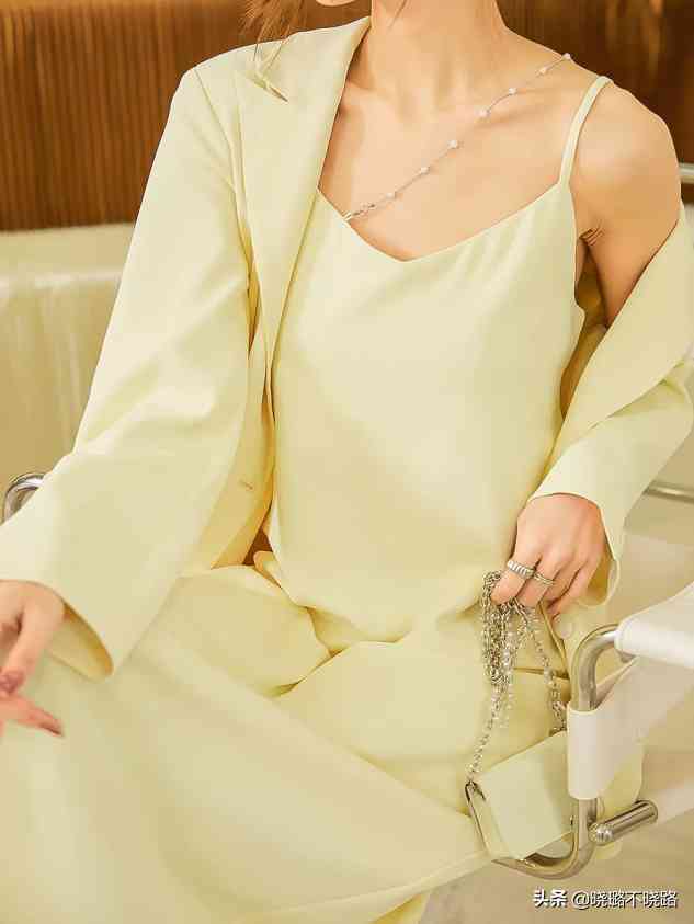 西服的质感来源于纯色的面料和立体的轮廓版型,所以纯色系会成为西服色彩的.优选。为这套衣裙造型增添适当的时尚感,我们需要从吊带裙的花色切入做起。