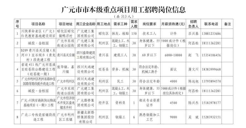 附件3:广元市市本级重点项目用工招聘岗位信息