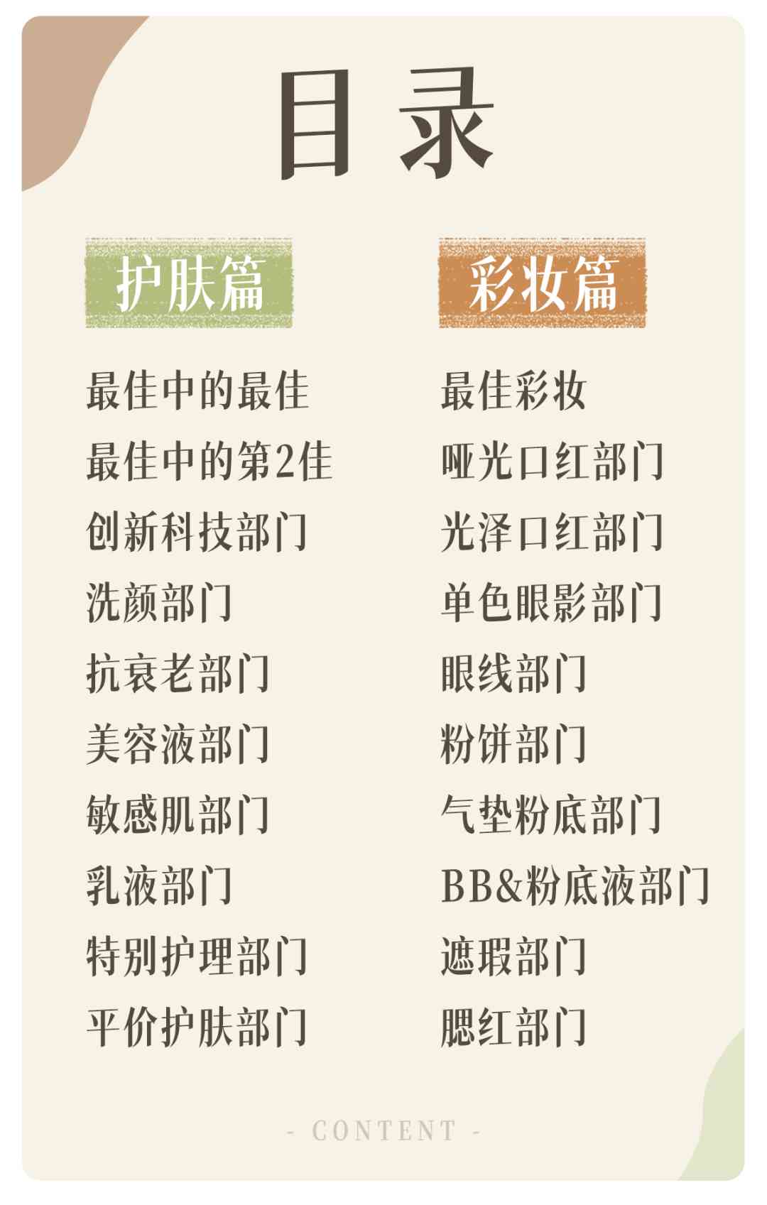 这次的best大赏是每年都会举办的!而且还分为护肤篇和美妆篇,同时产品的分类也十分细致。