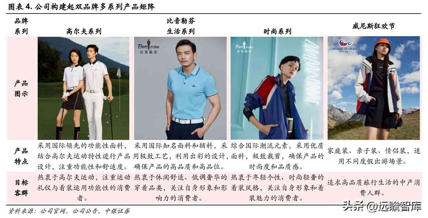 主品牌比音勒芬定位于高尔夫运动与时尚休闲生活相结合的细分市场,品牌旗下先后开发设立高尔夫、生活、时尚 3 个产品系列,目标客群广泛覆盖到高尔夫文化爱好者、品味偏好低调奢华的高收入人士以及热衷个性、时尚着装风格的年轻消费者。