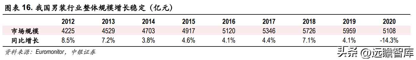 我国男装行业稳定发展,市场规模逐步增长。根据欧睿咨询统计数据,男装规模在 2003 年-2011 年间经历双位数高速增长,2012 年后增速放缓,除 2020 年受疫情影响的低基数外目前已稳定在 4%左右,处于稳定增长阶段。