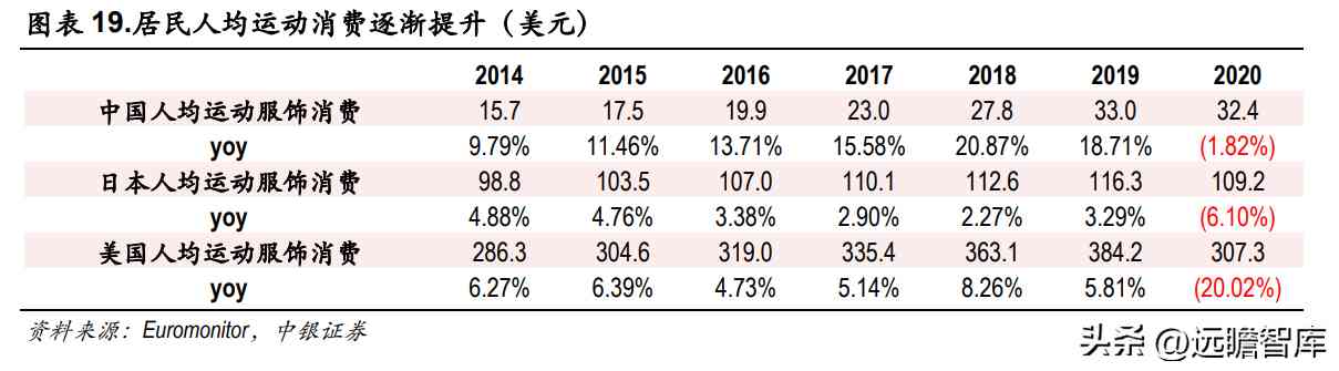 1)政策层面政府大力扶持,体育强国建设推动运动行业高速发展:2019 年 9 月,《关于促进全民健身和体育消费推动体育产业高质量发展的意见》,提出 10 个方面政策举措,推动体育产业成为国民经济支柱性产业。未来随着政策支持方式的不断优化,将形成政府、市场双轮驱动效应,有助于在保证体育产业快速增长的同时提高发展质量,国内运动服饰行业将显著受益。