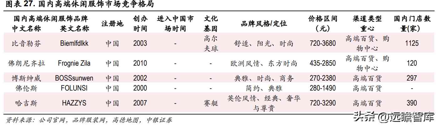 1)国内高端休闲服饰品牌:包括比音勒芬(Biemlfdlkk)、佛朗尼齐拉(Frognie Zila)、博斯绅威(BOSSsunwen)佛伦斯(FOLUNSI)和哈吉斯(HAZZYS)5 个品牌。与国内高端休闲服饰品牌相比,比音勒芬具有渠道布局、文化底蕴等多方面优势。