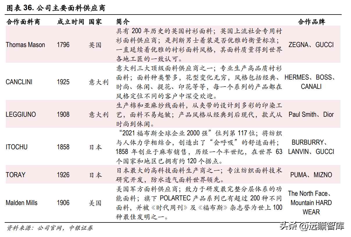 该竞争格局大致可以描绘为国内高端休闲服饰品牌、国际高端休闲服饰品牌和国际专业高尔夫服饰品牌 3 个类别,共包含比音勒芬、金狐狸、沙驰等 17 个品牌,其中:
