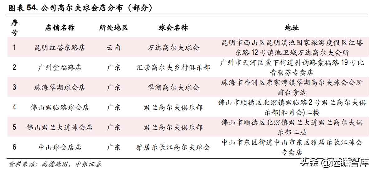 高尔夫球会店是公司另一特定场景的销售渠道,截至 2022 年 3 月我们在高德地图上搜索到 6 家高尔夫球会门店,均开设在国内知名高尔夫球会会所附近。高尔夫球会店的设立凸显了品牌内在的高尔夫文化基因,配合旗下的高尔夫系列对高尔夫球爱好者以及偏好高尔夫服饰风格的高收入人群展开针对性营销。