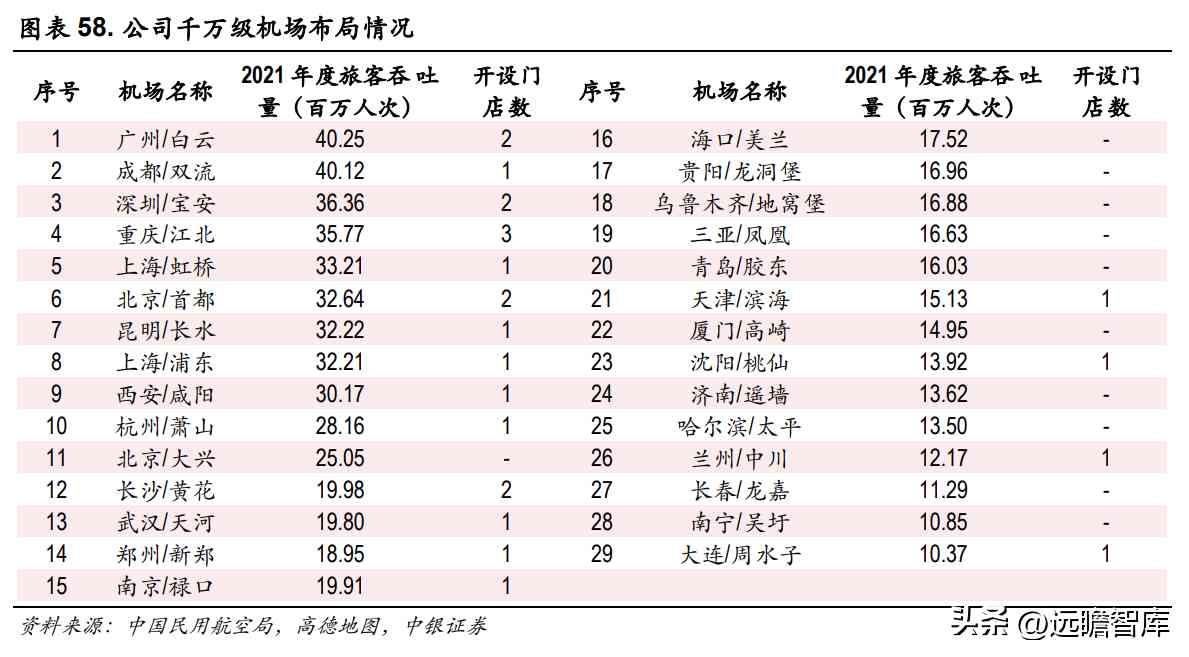 此外数据还显示,2021 年全国范围旅客吞吐量达 1000 万人次以上的机场数量有 29 个,客运吞吐量占全国比例达 70.78%。公司在这 29 家机场中布局了 18 家机场共个 24 个门店,渗透率为 62.07%较高,但仍有一定布局空间。