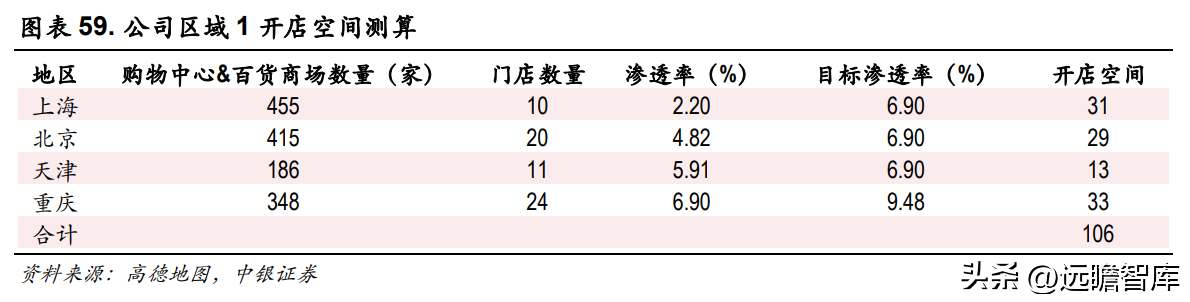 对于区域 1 渠道空间的预测,采用购物中心及百货商场体量渗透的方法。我们假设区域 1 中所有地区未来均具有达到区域内最大渗透率的开店空间,因而使用重庆市目前的渗透率作为区域内其他地区的目标渗透率,进而计算开店空间。