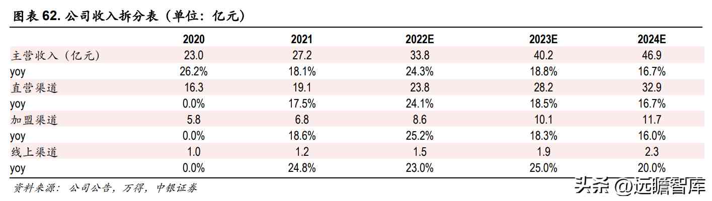 加盟渠道:随着持续新开门店叠加优化门店质量,预计 2022-2024 年收入分别为 8.6/10.1/11.7 亿元,同比增长 25.2%/18.3%/16.0%。