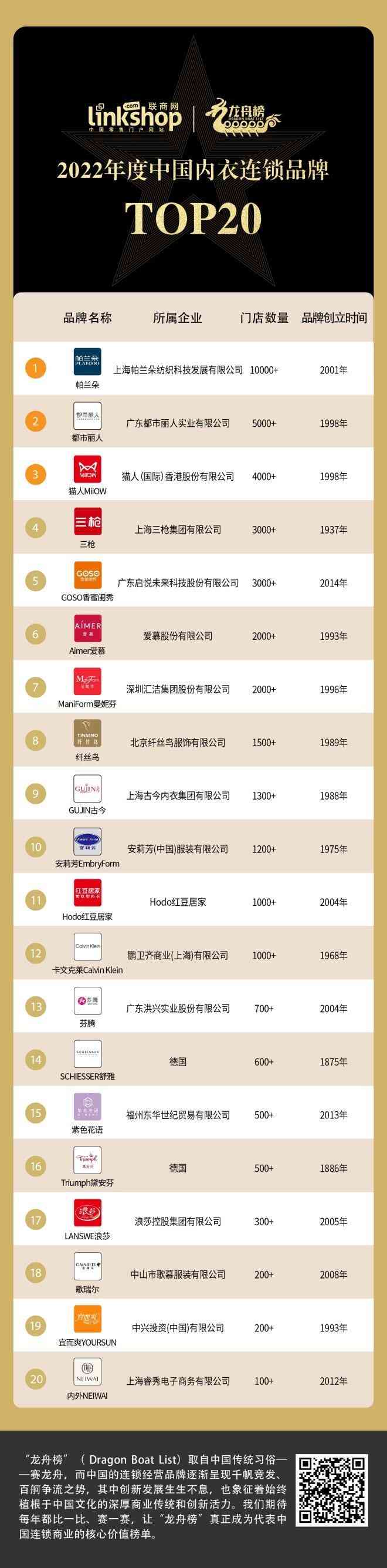 本期,《联商网》特别推出龙舟榜之“2022年度内衣连锁品牌TOP20,从门店数据直观了解内衣这一赛道上各大品牌的发展规模,同时辅以门店评分、融资情况等维度,对这些品牌进行全面分析观察,从而一探内衣在中国的发展趋势。