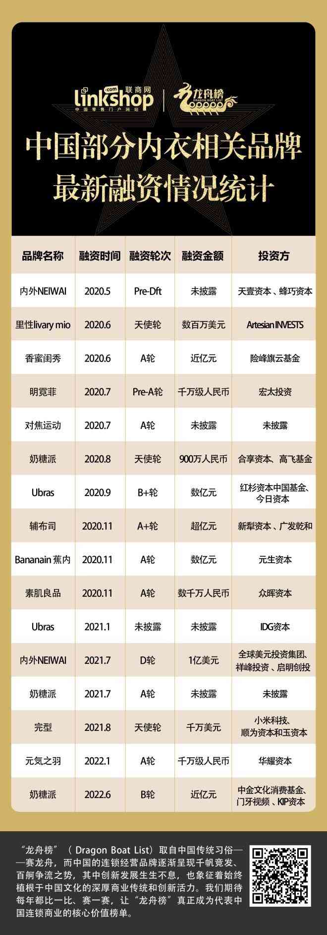 除了门店规模和好评度,融资情况一定程度上也反映了企业的发展。因此,《联商网》盘点了近三年内衣品牌的融资情况。