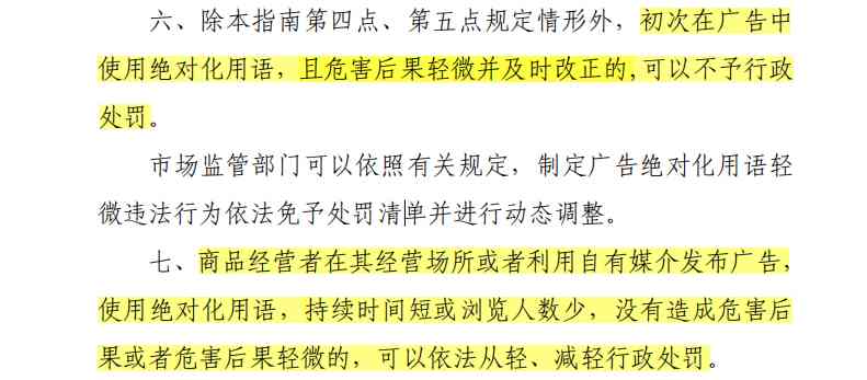 对此,征求意见稿进一步指出,市场监管部门对含有绝对化用语的商业广告开展监管执法,应当坚持过罚相当、公平公正、处罚和教育相结合、综合裁量的原则,实现政治效果、社会效果、法律效果相统一。