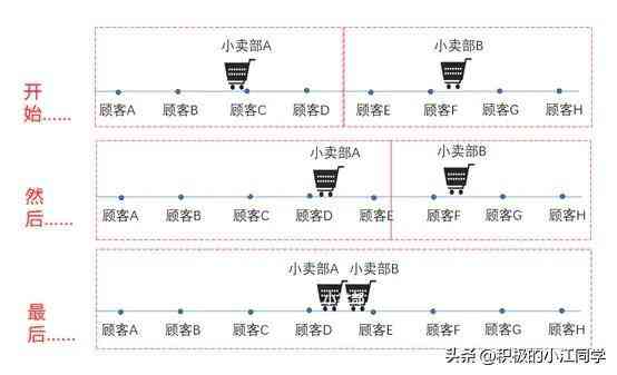 于是小卖部A搬到了街中心的位置,小卖部B的生意自然就下降了,于是小卖部B也搬到街中心,跟小卖部A靠在一起。