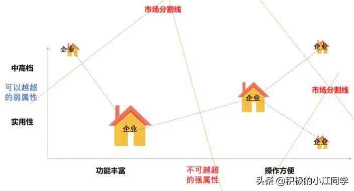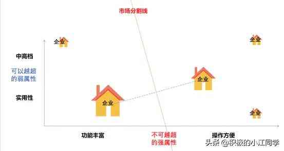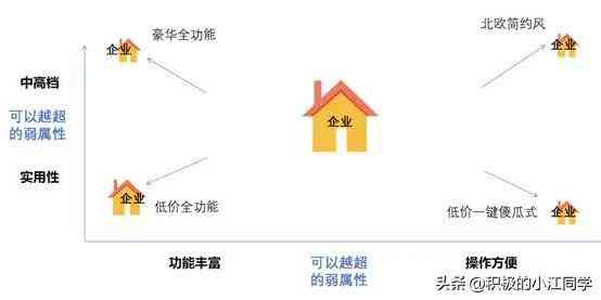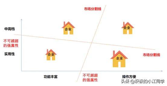 比如“企业A”选择了“实用性”,一旦竞争策略得当,被市场认可,规模迅速扩大,拥有了强大的竞争力。那么,从产品定位的角度,企业B最容易避免激烈竞争的定位就是站在“中高档”这一边,并且也在“功能丰富——操作方法”中选择中间的位置。