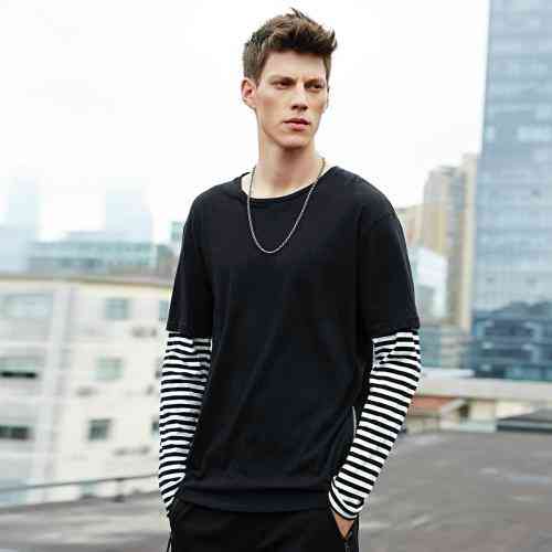 这件T恤的假2件设计让人一眼看上去就潮味十足。经典的条纹袖子,剪裁平整,线条细腻;配上黑色的衣身,堪称完美的组合。此款T恤选用棉毛布面料,穿着舒适,不起球不变形。大方得体的圆领设计,顺应潮流,修饰脸型更好看, 活动更自由。T恤整体简洁明快、时尚百搭、凸显青春休闲气质。 随意搭配一条休闲长裤,轻松穿出型男风范来。