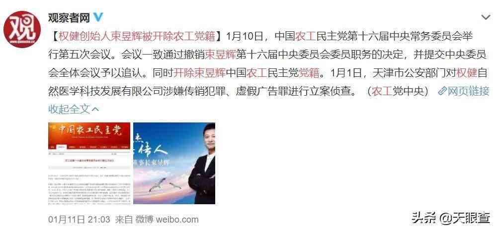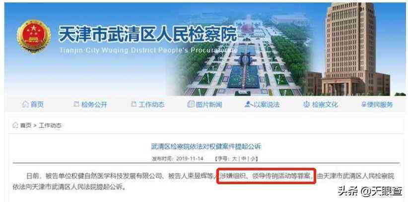 据悉,今年1月1日,天津市公安机关对权健自然医学科技发展有限公司涉嫌组织、领导传销活动罪和虚假广告罪立案侦查。当月13日,武清区检察院批准逮捕束昱辉等人。