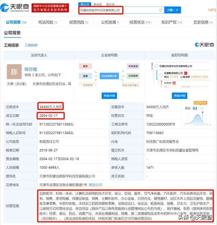 据天眼查信息显示,权健自然医学科技发展有限公司成立于2004年2月,注册资本3.45亿,公司经营范围包括自然医学、保健品制造、中药材收购、鞋垫制造和销售、卫生巾和卫生护垫生产、远红外床上用品及服饰、以直销方式经营化妆品等。