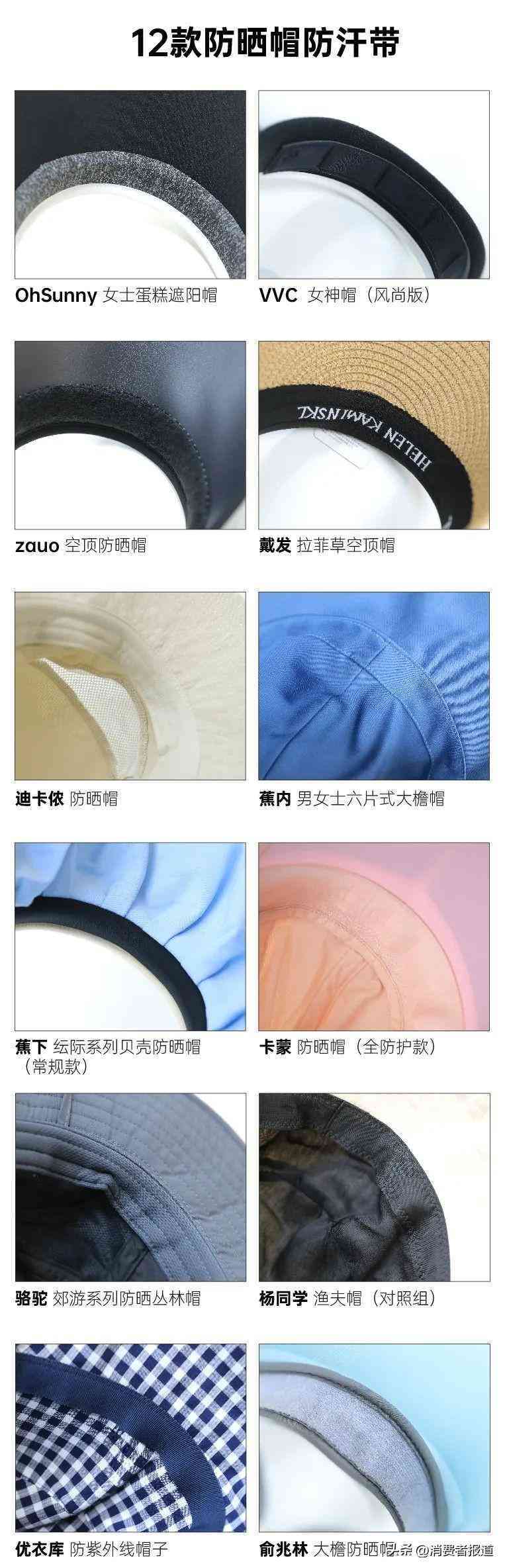 12款防晒帽中,防汗带的设计各有不同,其中,VVC的防汗带最为贴心,可以拆卸下来方面清洗,而其余11款产品均不能拆卸。