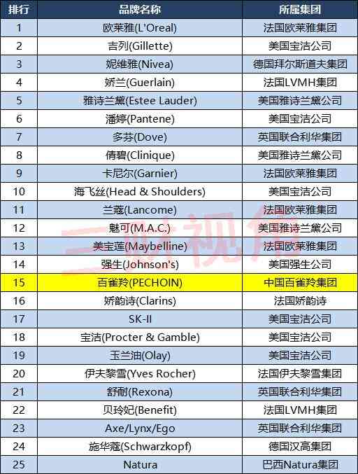从所属企业来看,有9个品牌来自美国保洁公司,7个品牌来自英国联合利华集团,6个品牌来自法国欧莱雅集团,4个品牌来自美国雅诗兰黛公司,3个品牌来自法国LVMH集团,3个品牌来自巴西Natura集团,不难发现化妆品和个人护理品牌的集中度非常之高,欧美几个发达国家已经形成了头部垄断,而且强强联合的趋势非常明显。